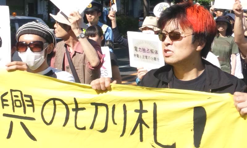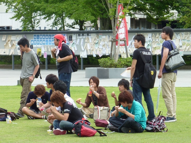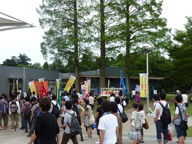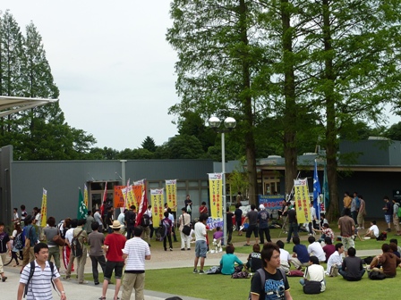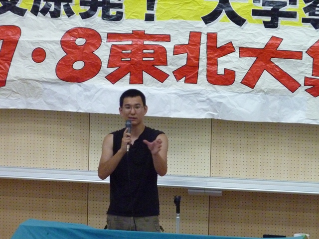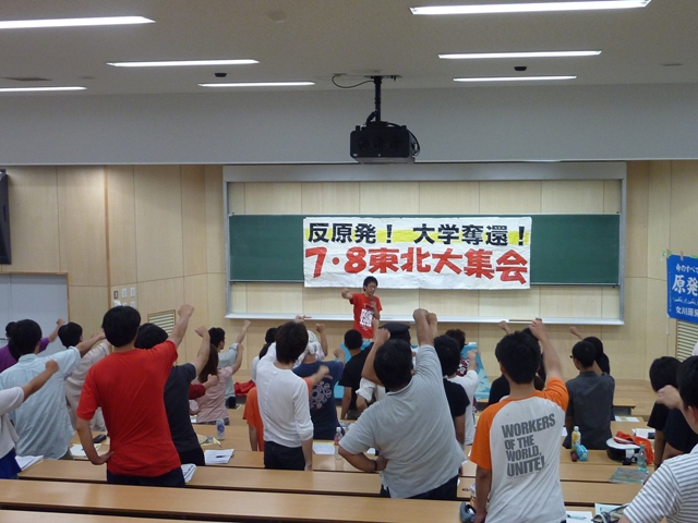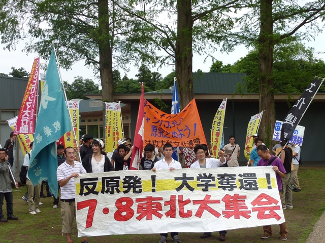 7月8日、東北大学川内北キャンパスで東北大学学生自治会が呼びかける「反原発!大学奪還! 7・8東北大集会」が行われました。昼休み、1000人をこえる学生がキャンパス中央に出てくるなか、集会は始まりました。東北大学学生自治会委員長の石田くんの司会で始まった集会に全学生の注目が集まり、福島大や法政大、広島大などから参加した学生の訴えがキャンパス全体に響き渡りました。芝生に座って聞き入る学生のグループ、立ち止まって集会を見ている学生、遠巻きにも多くの学生が注目している。いたるところで討論が始まっていました。東北大の1年生のアピールは圧巻!