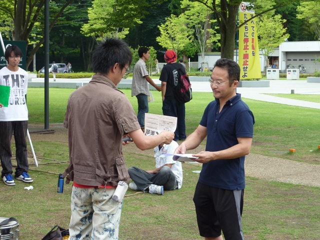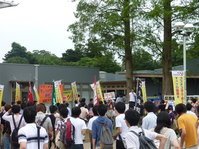 そして、学生の怒りの決起に恐れをなした大学当局は、集会を妨害しにのこのことやってきました。これを学生が追及! 学生の声に、まったく向き合おうとしない大学当局の姿勢は、隠蔽体質の東電や、やらせメールの九電と同じです。逃げようとする東谷篤志(学長特別補佐)を包囲し、申し入れ書を受け取らせました。その後、学内をデモ行進。サークルからの声援も!