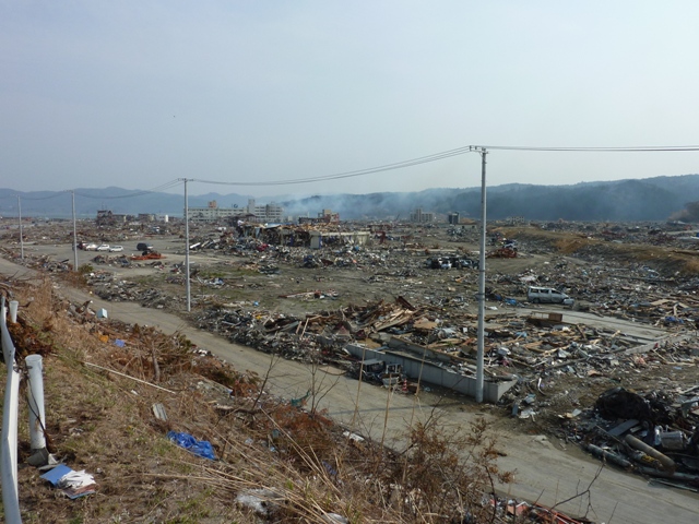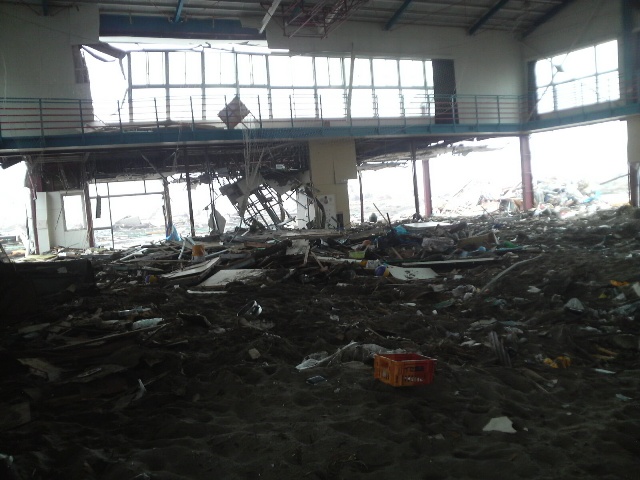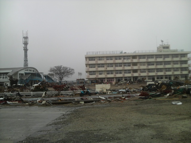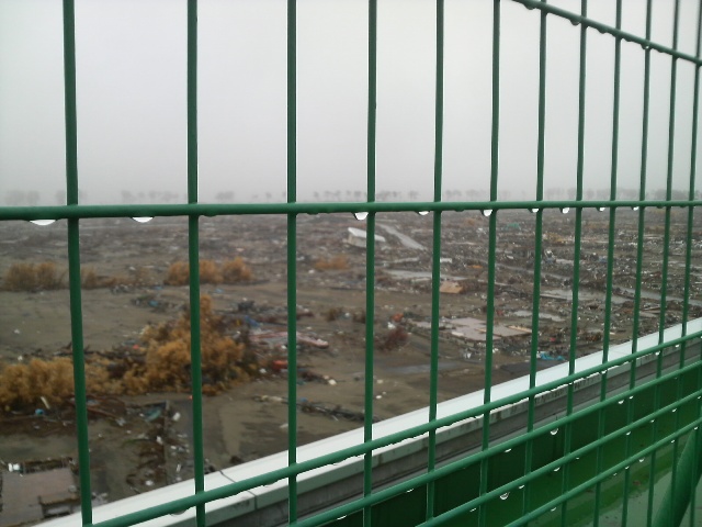 屋上に上る。屋上はあまり広くはない。ここで何人の人が津波の「じごく」を目にしたのだろうか。屋上からは荒れ果てた荒浜地区が見渡せる。海岸沿いにある松林はとても近い。残った建物はほんのわずか。壊滅状態だ。後日、ネットに出ている映像を見た。屋上から津波の様子を撮影したものだが、荒波を進む船のような感じで、手を伸ばせば波に届きそうなくらい近い。家も流されている。悲鳴や叫びも聞こえる。