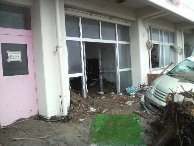 校舎入り口には、仙台市災害対策本部の「検索終了」の張り紙が。捜索したのは自衛隊とのことだ。ここで亡くなった人もいたんだろうか。