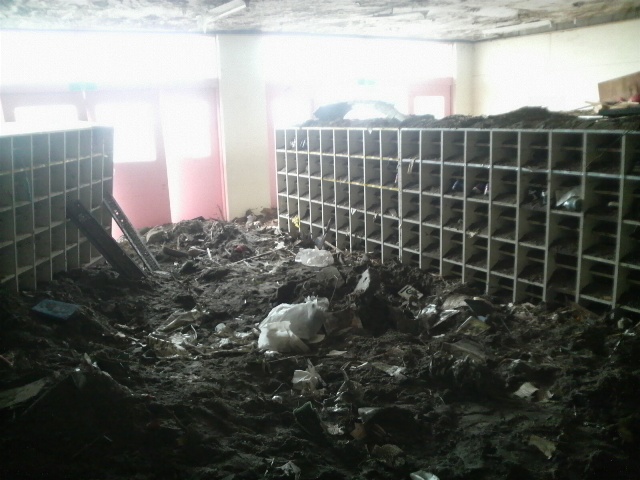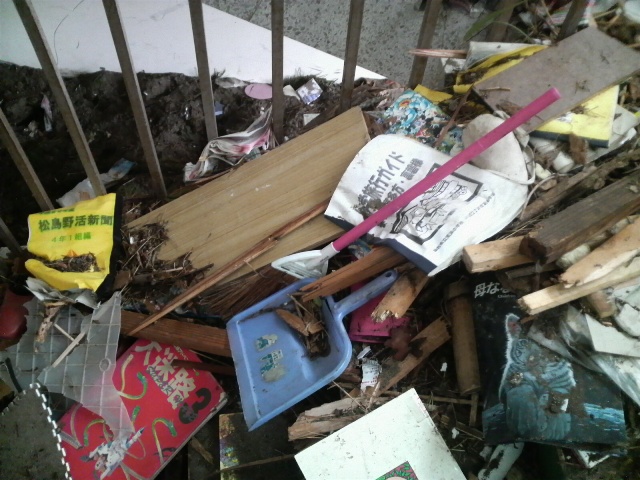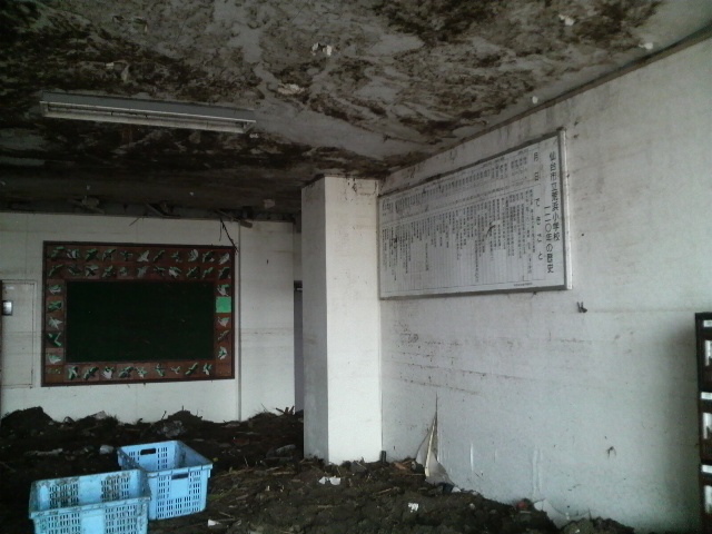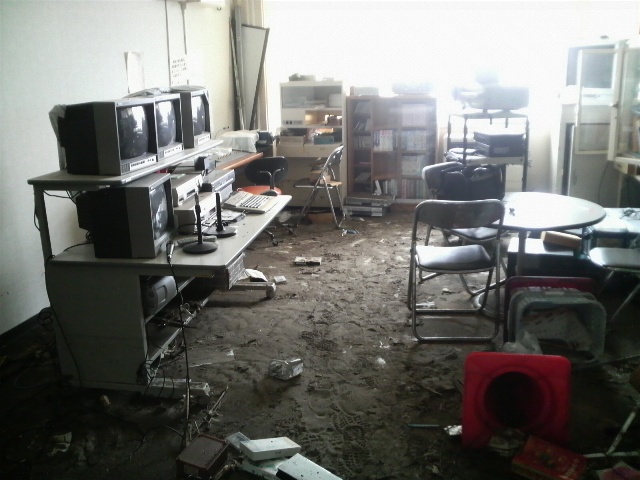 2階にも土砂があった。1階よりは少ないがここまで来たのかと驚く。放送室は放送器具はかろうじて残っていたが、ビデオテープなどが散乱している。