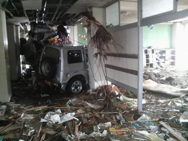 振り返ると、廊下に車が2台つっこんでいる。1台は天井に突き刺さっている。恐怖を感じる。「一体これは何なんだ」。隣の教室も大量の土砂が堆積し、ごみが散乱している。