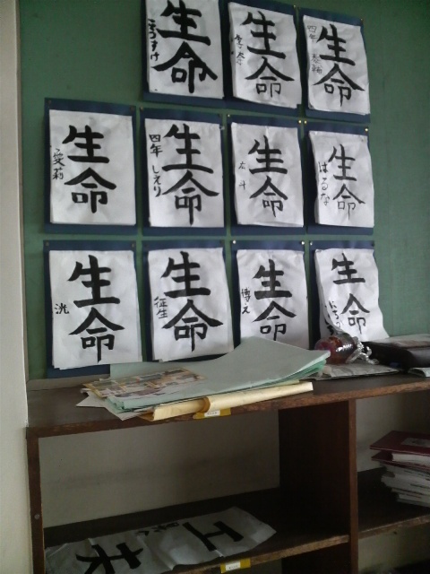 3階の教室。後ろに張られている4年生の生徒たちの習字。書かれていた文字は「生命」。