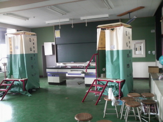 別の教室には、仙台市の災害用仮設トイレ2台が置かれたままになっている。