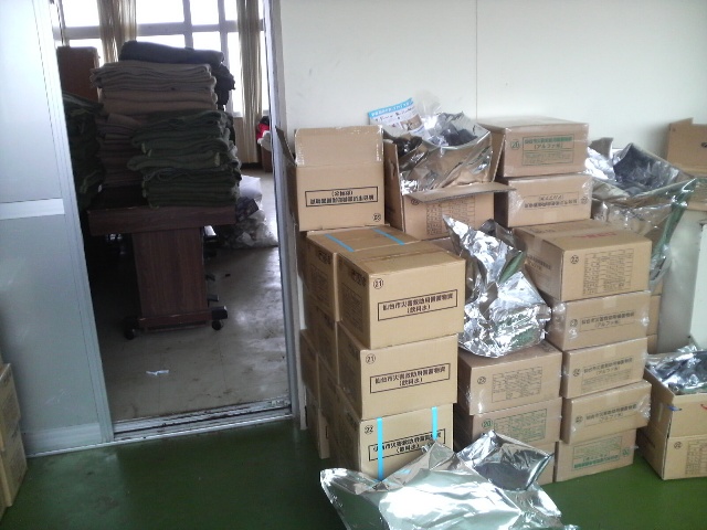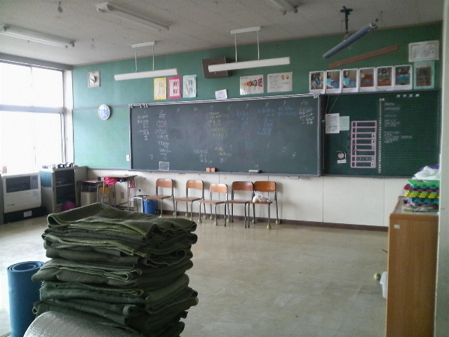 4階。教室と廊下には大量の毛布と備蓄用の飲料水、アルファ米が残されている。黒板には避難していたと思われる人の名前が書かれている。