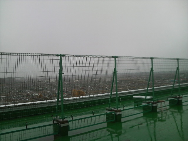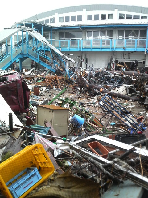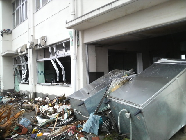 校舎を出る。校舎と体育館の間には大量のがれきが存在している。校庭はきれいになっているので、ここに集められたようだ。校舎の裏に回ってみると、給食配膳室の大きな冷蔵庫2台が倒れて外に飛び出している。窓枠もめちゃくちゃになっている。