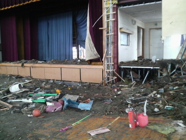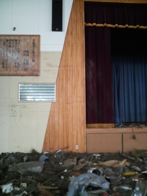 体育館。土砂が厚く堆積していて、体育用具も散乱している。2階の窓も破壊されていて、2階にいたら助からなかったのではないかと思う。ところどころ床が見えるが、床板が波打つように傾いている。舞台のカーテンに水の跡がある。数メートルの高さはある。