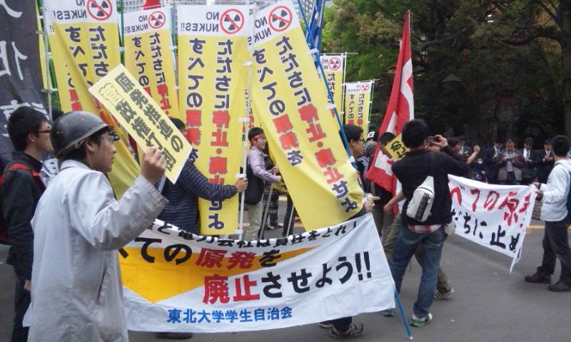 東北大学学生自治会の主催した原発廃止デモ&東北電力抗議行動に、何人もの青年労働者が飛び入りで参加しました。今回のデモは、被災地・仙台において初めての反原発デモとして打ち抜かれました。