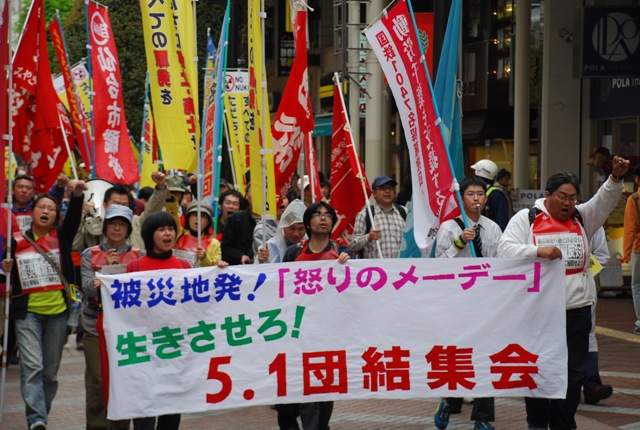 本日は、3・11大震災から最初のメーデーです。国際的に労働者が団結し、資本と闘い、戦争をとめるために行動する日です。「怒りのメーデー」を出発点に、全国・全世界の闘う労働者の仲間とともに、あらゆる困難を乗り越え、新自由主義を打ち破ろう。労働者を食べさせられなくなった資本主義に終止符を打ち、労働者が主人公の社会を建設していく歴史的大運動を、被災地から開始しよう。