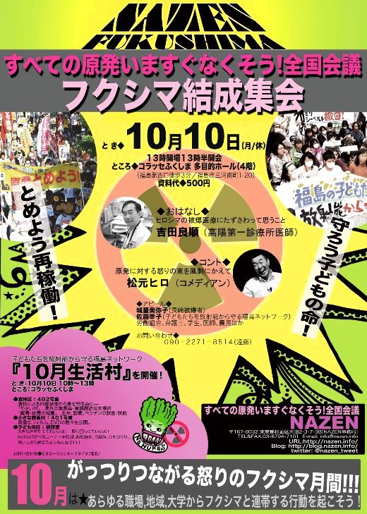 私たちは11・6に向かって、この10月、「フクシマ連帯月間」として、あらゆる職場、地域、大学から、フクシマ連帯を掲げた行動を起こすことを呼びかけます。原発立地やホットスポットの危険と闘う住民のみなさん、闘う労働組合を取り戻し、非正規職も被曝労働も原発推進教育も廃絶するために闘う労働者のみなさん、子どもの被曝と向きあう医療関係者のみなさん、食の安全のために闘う農漁民のみなさん、司法を変えるために努力する弁護士のみなさん、そして御用学者と闘う学生のみなさん、技術者・研究者のみなさん。あらゆる闘いをフクシマとつながるひとつの運動にして、原発をなくすうねりをますます拡大しましょう。10月10日には福島現地においてNAZENフクシマ結成集会を開催します。こちらへの参加も改めて呼びかけます。