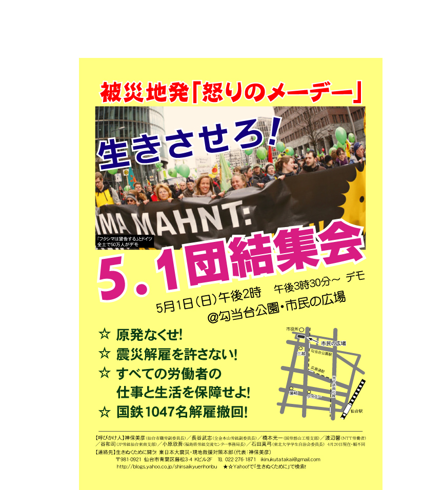 5月1日、『被災地発「怒りのメーデー」 生きさせろ! 5.1団結集会」を行います。連合はメーデーの中止を決定し、労働者の怒りを押さえ込むことに躍起になっています。県内のある地区では、会場が取れないためにメーデーの日をずらそうとしたことに対して、現場組合員の「ふざけるな! 会場なんかどこでもいい。5月1日にやるからメーデーの意味があるんだ!」という突き上げが起きています。職場や街頭にあふれる怒りと結びつけば、千・万の闘いに必ず爆発していきます。5・1メーデーを爆発させ、全国・全世界に被災地は力強く闘っていることを発信していきましょう!